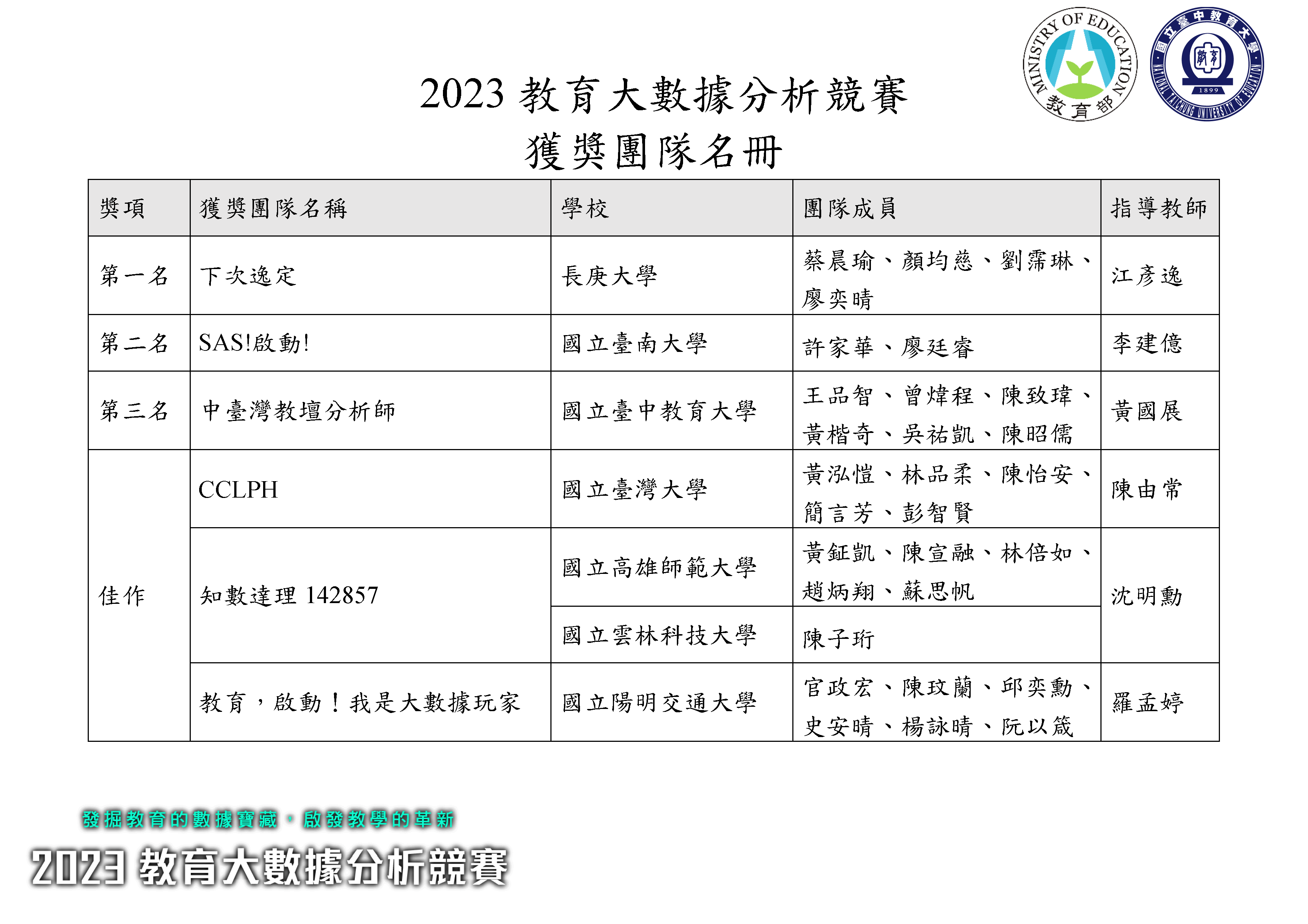 | 2023教育大數據分析競賽_獲獎團隊名冊 | 下載 |